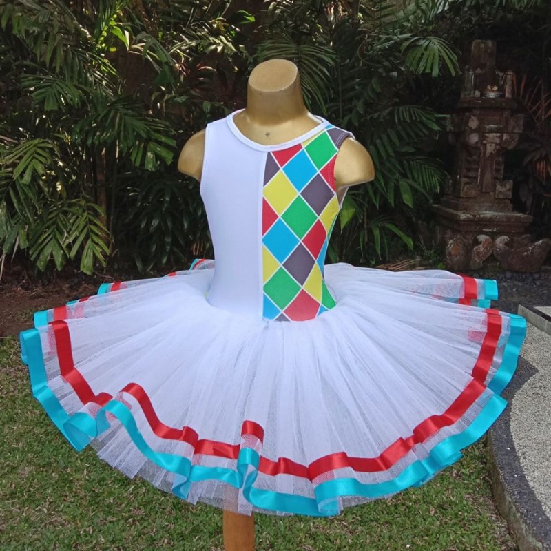 Half White and Half Multicolor Diamond Leotard, with White Tutu Skirt And Ribbons Highlighted
